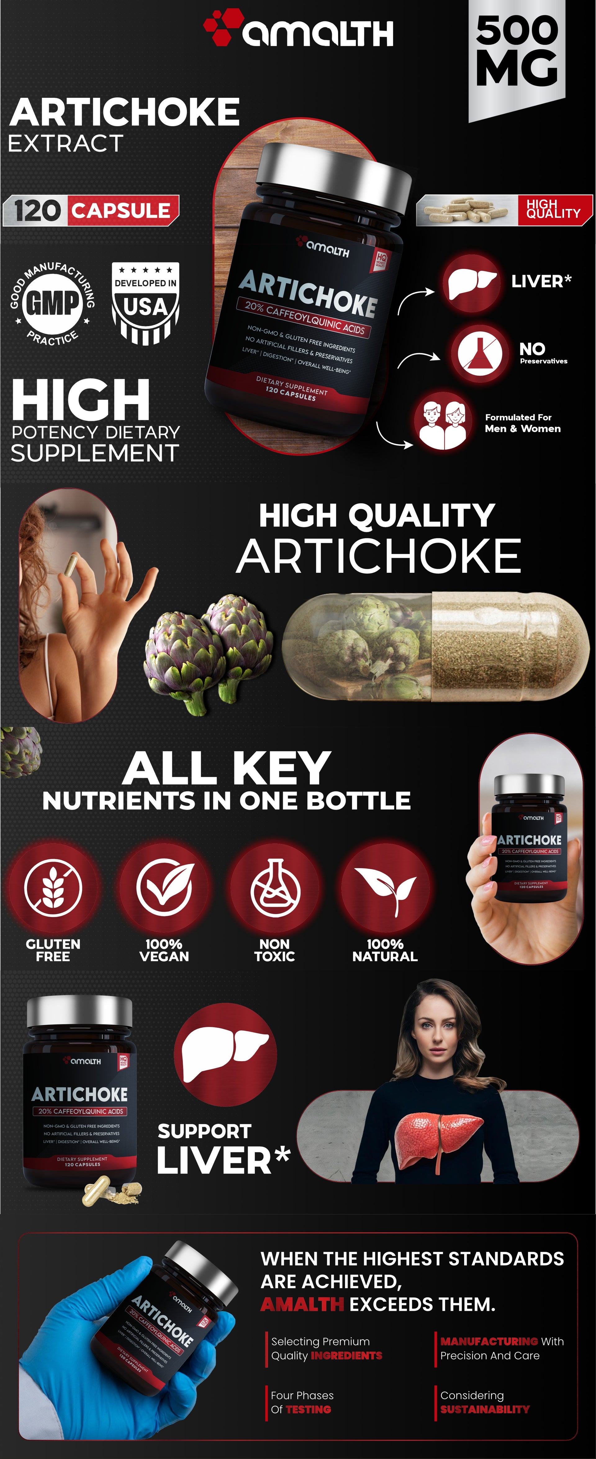 • POTENT WITH 500 MG EXTRA STRENGTH: Amalth Artichoke leaf extract capsule is made from authentic and matured Artichoke leaf to form standardized herbal extracts. Amalth Artichoke leaf extract that contains potent and rare leaves. Our product is formulated with 20% caffeoylquinic Acids standardized extract. Artichoke leaf powder prepared by extraction method to enhance maximum potency of ingredients into the body.