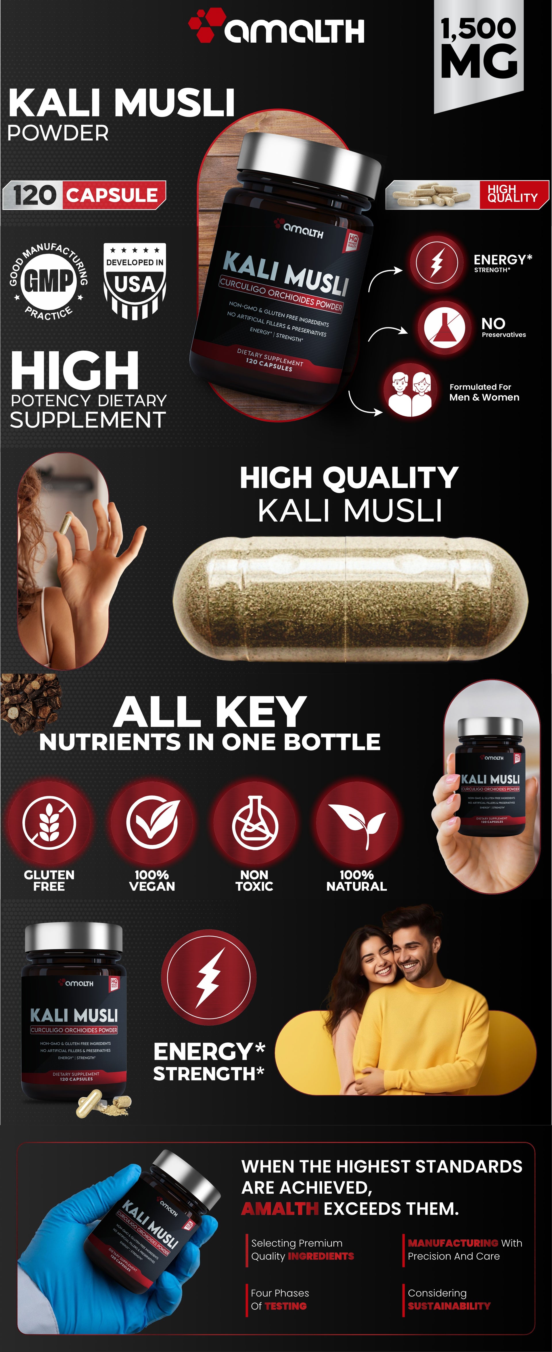 ✅ FORMULATED WITH 1500 MG HIGH GRADE POWDER: Amalth Kali Musli powder capsule is made from authentic and matured herbs. Our product contains pure and premium grade Kali Musli powder. Each batch is prepared without the loss of active ingredients. Each capsule is crafted without harmful chemicals and preservatives.Our product does not contain any fillers or binders.