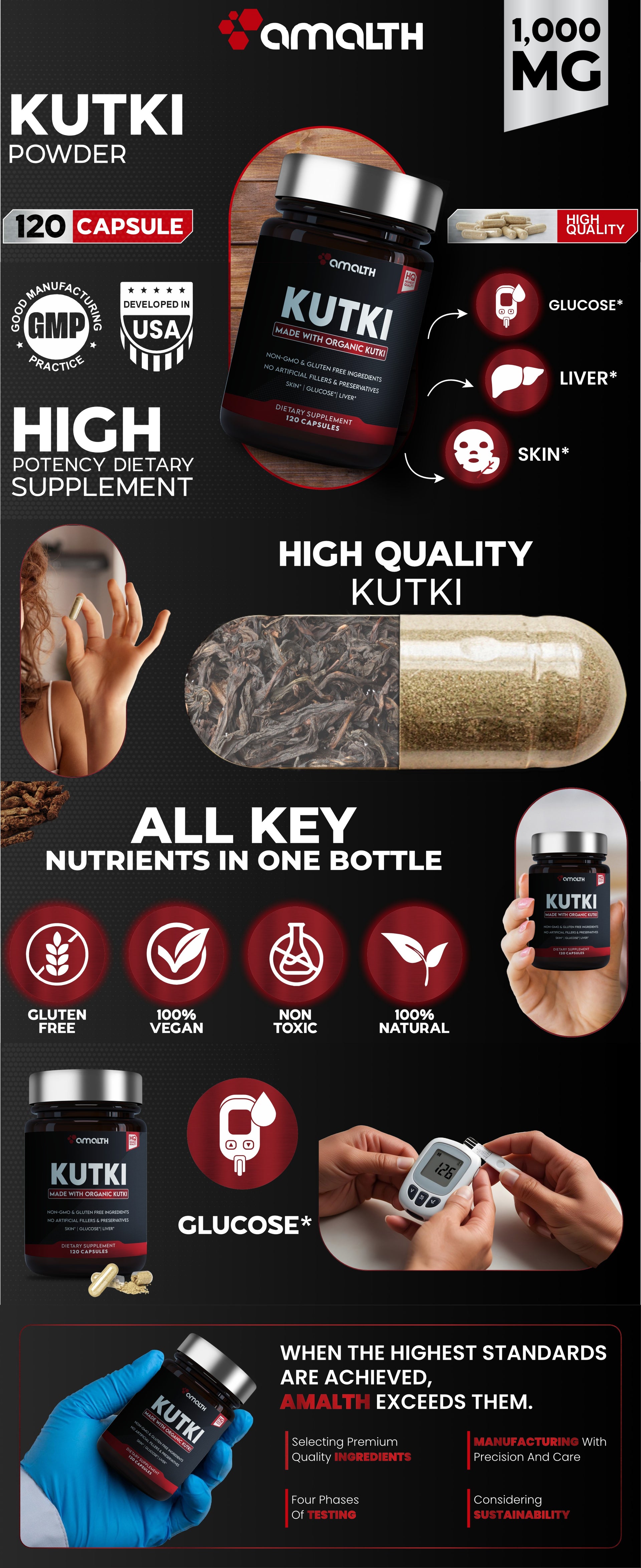 ✅ SAFE, EFFECTIVE INGREDIENTS: Amalth Kutki capsule is formulated with the safest and gentlest herbal✅ AMALTH ASSURED QUALITY: All our supplements are made according to latest GMP standards. Raw material and other Nutraceuticals ingredien ingredients. This product is NON- GMO, sugar free, dairy free, yeast free, wheat free, gluten free, tree nut free and dairy free. Products are tested for purity and are free from harmful chemical and preservatives. No fillers are used when formulating products.