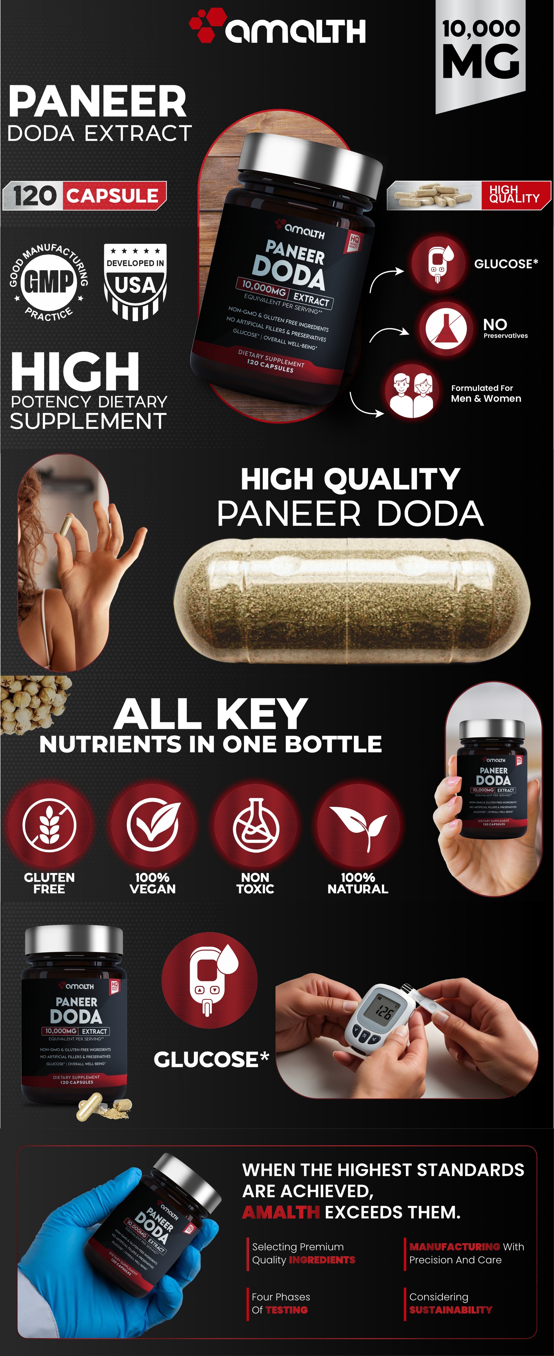 • ✅ FORMULATED WITH 10000 MG EXTRA STRENGTH: Amalth Paneer doda extract capsule is made from authentic and matured herbs with standardized herbal extracts. Amalth Paneer doda extract that contains potent and rare leaf herbs. Our product added with concentrated standardized extract which is equivalent 10,000 mg of raw Paneer doda powder prepared from water extraction method to enhance maximum potency of ingredients into the body. Each capsule crafted without harmful chemical and preservatives.