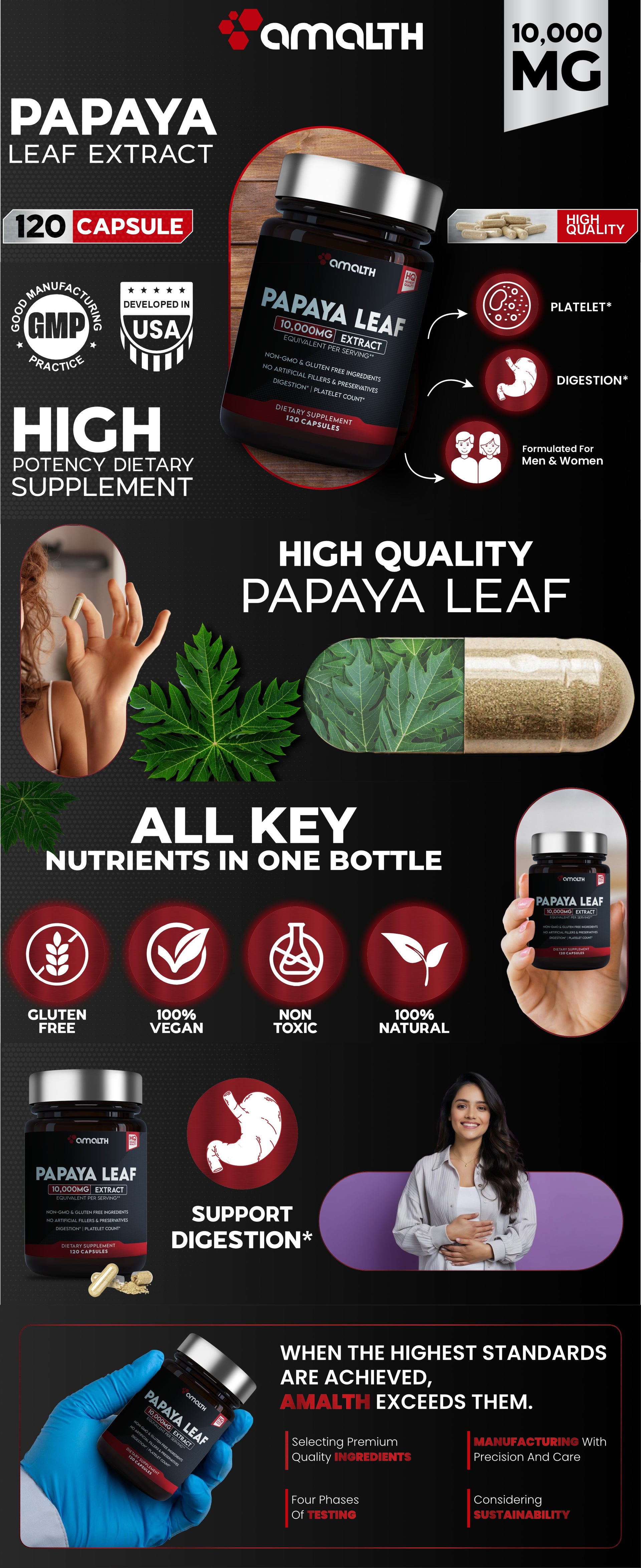 • ✅ FORMULATED WITH 10000 MG EXTRA STRENGTH: Amalth Papaya leaf Extract capsules is made from authentic and matured herbs with standardized herbal extracts. Amalth Papaya leaf Extract that contains potent and rare leaf herbs. Our product added with concentrated standardized extract which is equivalent 10,000 mg of raw Papaya leaf powder prepared from water extraction method to enhance maximum potency of ingredients into the body.