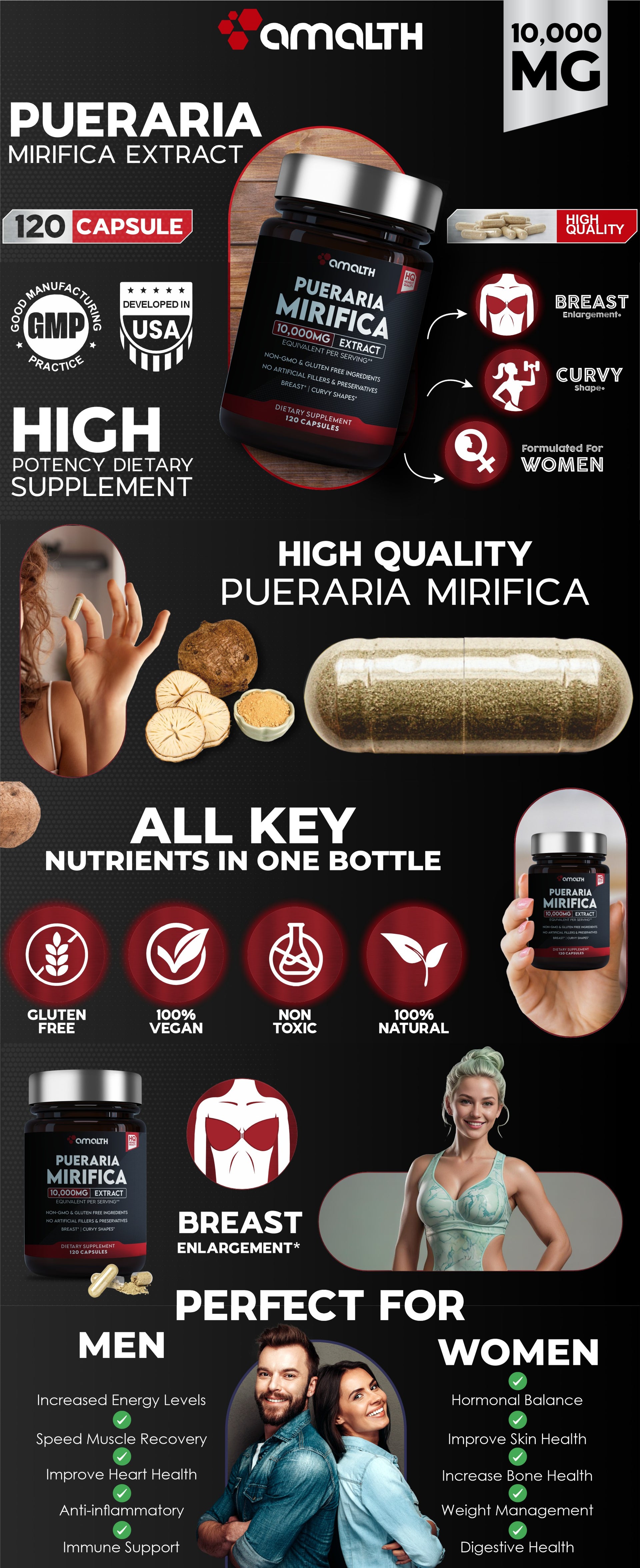 • ✅ FORMULATED WITH 10000 MG EXTRA STRENGTH: Amalth Pueraria Mirifica Extract capsules is made from authentic and matured herbs with standardized herbal extracts. Amalth Pueraria Mirifica Extract that contains potent and rare leaf herbs. Our product added with concentrated standardized extract which is equivalent 10,000 mg of raw Pueraria Mirifica powder prepared from water extraction method to enhance maximum potency of ingredients into the body.